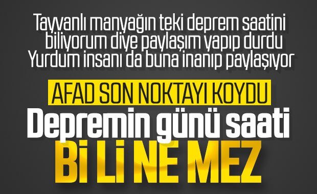 AFAD’dan yapılan açıklamada, “Bir depremin gün ve saati verilerek önceden kestirilmesi günümüzün teknolojik imkanlarıyla mümkün değildir. Vatandaşlarımızın spekülatif bilgilere itibar etmemeleri, doğru bilgi için resmi kaynakları takip etmeleri önemle rica olunur.” ifadesine yer verildi.