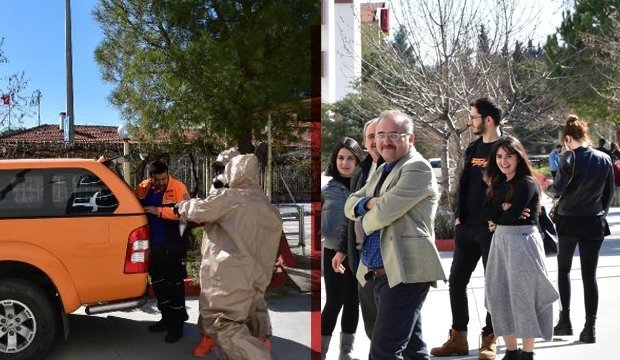 MSKÜ Meslek Yüksekokulu’nda, Kimya ve Kimyasal İşleme Teknolojileri Bölümü Kozmetik Teknolojileri Programı’nda görevli Doç. Dr. İbrahim Kıvrak, dün öğle yemeği için dışarıya çıktı. Doç. Dr. Kıvrak, makam odasına geri döndüğünde, kapısının altından zarf bırakıldığını gördü. Zarfı açıp kontrol eden ve içinde beyaz toz gören Kıvrak, 112 Acil Çağrı Merkezi’ne ihbarda bulundu. İhbarın ardından olay yerine polis, sağlık ve Muğla İl Afet ve Acil Durum Müdürlüğü (AFAD) ekipleri sevk edildi. Özel kıyafet giyen AFAD görevlileri incelemek üzere zarfı aldı. Sağlık ekipleri ise Kıvrak ile odaya giren 2 kişiye, maske ve koruyucu elbise giydirdi. 3 katlı binadaki diğer görevliler, tahliye edildi. Binanın tamamı bir süre karantinaya alındı. Giydirilen özel kıyafetleriyle MSKÜ Hastanesi’ne ambulansla getirilip, kan ve idrar numuneleri alınan 3 kişinin tahlilleri temiz çıktı.