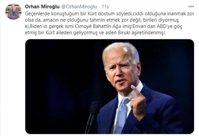 Biden’ın Kürt olduğunu öne süren Miroğlu, “Geçenlerde konuştuğum bir Kürt dostum söyledi, ciddi olduğuna inanmak zor olsa da, amacın ne olduğunu tahmin etmek zor değil, birileri diyormuş ki, Biden’ın gerçek ismi Cımoyê Bahattîn Ağa imiş! Erivan’dan ABD’ye göç etmiş bir Kürt aileden geliyormuş ve aslen Bıruki aşiretindenmiş” ifadelerini kullandı.
