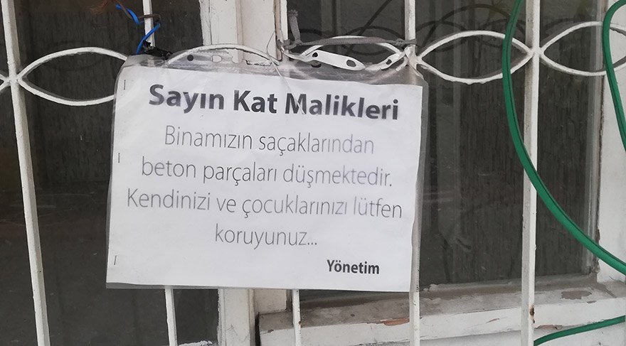 Osmaniye Mahallesi’ndeki Şahin apartmanı sakinleri binanın girişine “Binamızdan beton parçaları düşmekte kendinizi ve çocuğunuzu koruyun’ uyarı yazısı asmış.