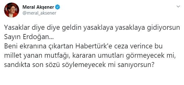 Akşener, sosyal medyadan yaptığı açıklamada Cumhurbaşkanı ve AKP Genel Başkanı Recep Tayyip Erdoğan’a seslenerek, “Yasaklar diye diye geldin yasaklaya yasaklaya gidiyorsun Sayın Erdoğan… Beni ekranına çıkartan Habertürk’e ceza verince bu millet yanan mutfağı, kararan umutları görmeyecek mi, sandıkta son sözü söylemeyecek mi sanıyorsun?” dedi.