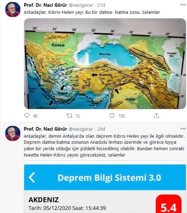 İsabetli deprem tahminleriyle bilinen Görür açıklamasında, “Antalya’da olan deprem Kıbrıs-Helen yayı ile ilgili olmalıdır. Deprem dalma-batma zonunun Anadolu levhası üzerinde ve görece kıyıya yakın bir yerde olduğu için şiddetli hissedilmiş olabilir” dedi.