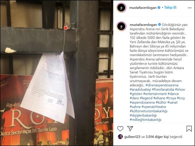 Aspendos Arena’nın kurucusu ve Anadolu Ateşi Genel Sanat Yönetmeni Mustafa Erdoğan, Instagram hesabından yaptığı paylaşımla mühürleme işlemine tepki gösterdi.