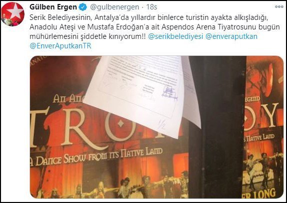 Mustafa Erdoğan’ın eski eşi şarkıcı Gülben Ergen de karara ilişkin Twitter hesabından yaptığı paylaşımda, “Serik Belediyesi’nin Antalya’da yıllardır binlerce turistin ayakta alkışladığı, Anadolu Ateşi ve Mustafa Erdoğan’a ait Aspendos Arena Tiyatrosu’nu bugün mühürlemesini şiddetle kınıyorum” ifadelerini kullandı.