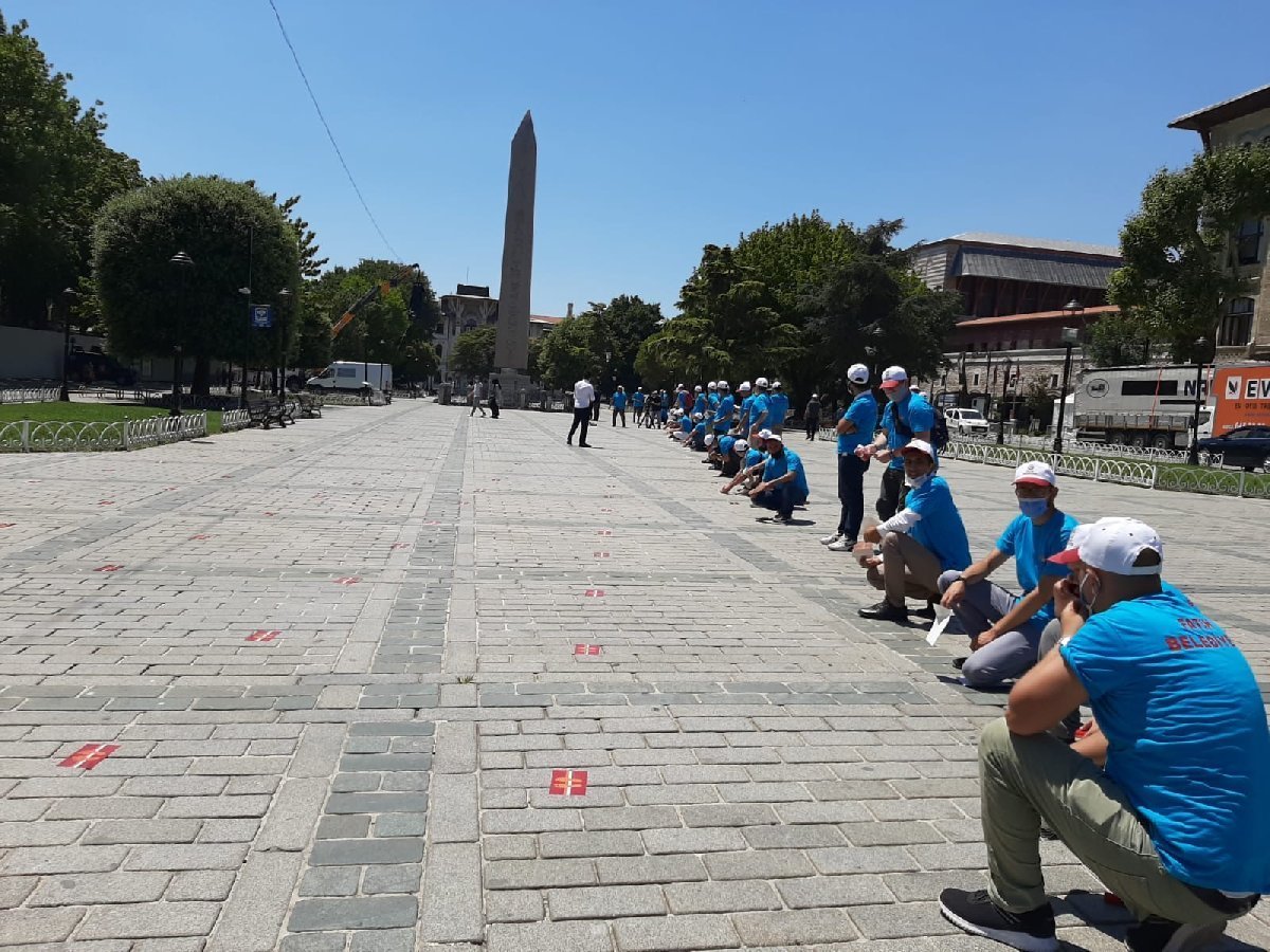 Fatih Belediyesi ekipleri, açılış öncesi Sultanahmet Meydanı’nda vatandaşların namaz kılacağı bölümde sosyal mesafe ayarlaması yapıyor. Namaz kılınacak alanda tek tek etiketler yapıştırılıyor. Yapıştırma işlemi öncesi iki kişinin arasındaki mesafeler ölçülerek belirleniyor. (DHA)
