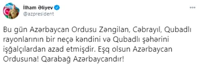 Aliyev, paylaşımında, 27 yıldır işgal altında bulunan Gubadlı kent merkezinin Azerbaycan ordusu tarafından kurtarıldığını belirterek, “Zengilan, Cebrail ve Gubadlı illerine bağlı bazı köyler de Ermenistan’ın işgalinden kurtarıldı” dedi.