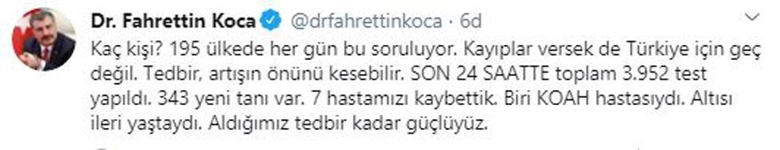 Türkiye’de ilk vakası 11 Mart’ta görülen corona virüsü can almaya devam ediyor. Sağlık Bakanı Fahrettin Koca, 7 kişinin daha hayatını kaybettiğini açıkladı. Sosyal medya hesabından açıklamalarda bulunan Koca, şu ifadeleri kullandı;