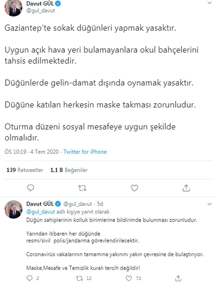 Gaziantep Valisi Gül, Twitter hesabından yaptığı açıklamada şunları belirtti: