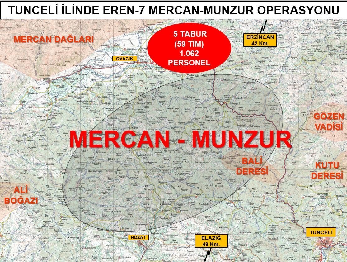 Bakanlıktan yapılan yazılı açıklamaya göre; bölücü terör örgütünü ülke gündeminden tamamen çıkarmak ve bölgede barındığı değerlendirilen teröristleri etkisiz hale getirmek amacıyla Tunceli’de ‘Eren-7 Mercan Munzur’ operasyonu başlatıldı.