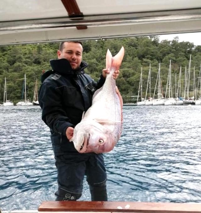 Ula’da itfaiye eri olan Erdem Yalçınkaya, geçen hafta sonu kaptan arkadaşı Cemil Şahin ile olta ile balık tutmak için tekne ile Gökova Koyu’ndan denize açıldı. ‘Slow jigging’ denilen yöntemle hassas, sahte yem takılı oltasını teknenin kıç kısmından denize atan Yalçınkaya beklemeye başladı. İki saat kadar sonra Yalçınkaya’nın oltasına büyükçe bir balık takıldı. Yalçınkaya oltasını sarıp, bırakarak yakaladığı balığı 22 dakika süren bir mücadelenin ardından güçlükle tekneye çekmeyi başardı.