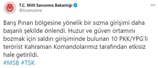 Barış Pınarı bölgesine yönelik bir sızma girişimi daha başarılı şekilde önlendi. Huzur ve güven ortamını bozmak için saldırı girişiminde bulunan 10 PKK/YPG’li terörist Kahraman Komandolarımız tarafından etkisiz hale getirildi.