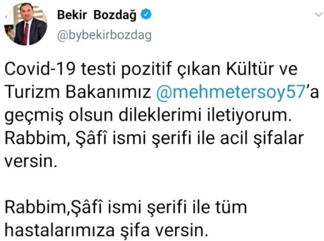 Koronavirüse yakalanan İçişleri Bakan Yardımcısı Mehmet Ersoy‘un tweetini alıntılayan Bekir Bozdağ, “Kültür ve Turizm Bakanımız Mehmet Nuri Ersoy’a geçmiş olsun” diye yazdı.
