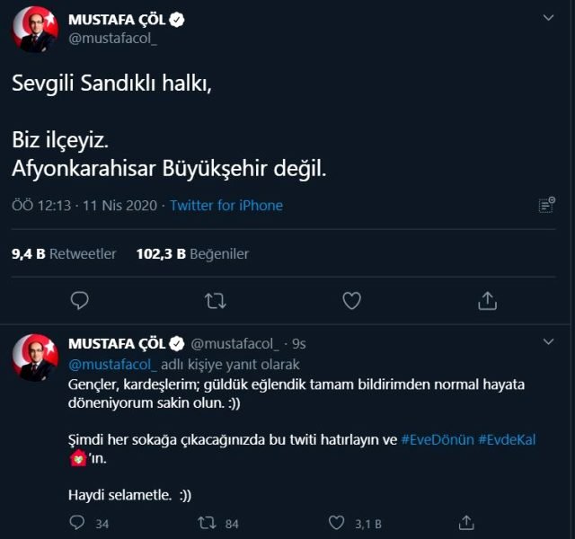 Panikleyen halkı sakinleştirmek isteyen Başkan Çöl mesajında, “Sevgili Sandıklı halkı, biz ilçeyiz. Afyonkarahisar Büyükşehir değil” diye yazdı.