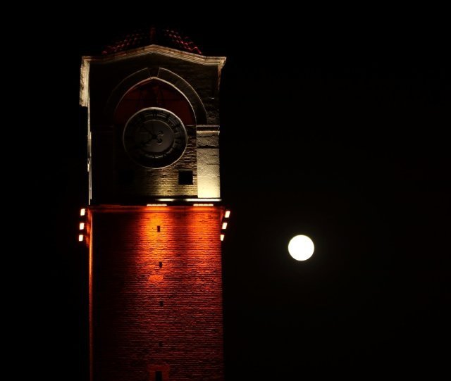 2020 yılında ikinci kez gözlemlenen ‘Süper Ay’ kentin simgelerinden Merkez Camii ve tarihi Büyük Saat Kulesi ile buluşunca seyrine doyulmaz bir manzara oluştu.