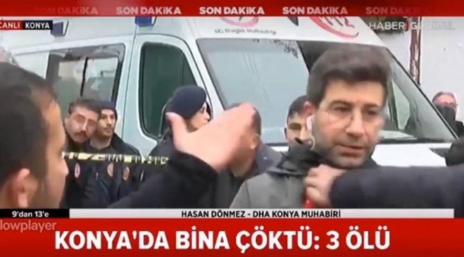 Konya’nın Karatay ilçesinde çöken binayla ilgili gelişmeleri aktaran DHA Muhabiri Hasan Dönmez, canlı yayında saldırıya uğradı. Görevi başında henüz kimliği belirlenemeyen kişilerce tekme tokat saldırıya uğrayan Dönmez, çevredekilerin araya girmesiyle kurtuldu.