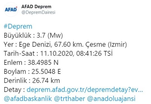 AFAD’dan yapılan açıklamada, Ege Denizi’de saat 08.41’de deprem meydana geldi. Çeşme açıklarında meydana gelen depremin büyüklüğünün 3.7 olarak açıklandı. Depremin derinliğinin ise 26.74 km olarak duyuruldu.