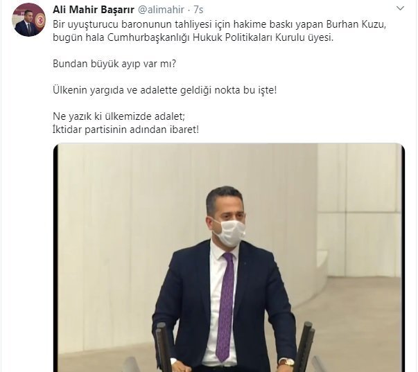 Twitter üzerinden paylaşım yapan Başarır, “Bir uyuşturucu baronunun tahliyesi için hakime baskı yapan Burhan Kuzu, bugün hala Cumhurbaşkanlığı Hukuk Politikaları Kurulu üyesi. Bundan büyük ayıp var mı?Ülkenin yargıda ve adalette geldiği nokta bu işte!” ifadelerini yazarak TBMM Genel Kurulu’nda yaptığı konuşmayı yayınladı.