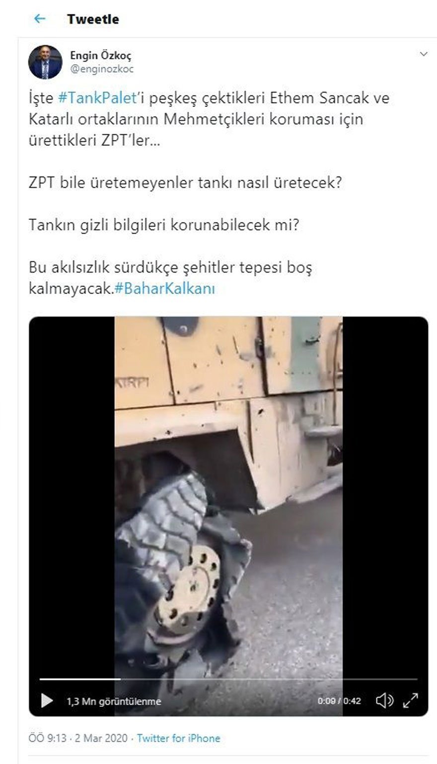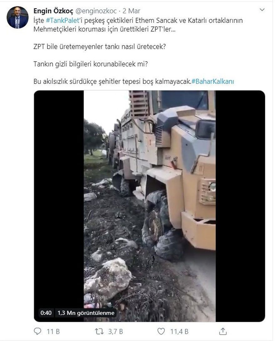 CHP Grup Başkanvekili Engin Özkoç, “İşte Tank Palet’i peşkeş çektikleri Ethem Sancak ve Katarlı ortaklarının Mehmetçikleri koruması için ürettikleri ZPT’ler” diyerek çatışma sonrası çekilen ZPT’lerin görüntüleri de paylaşmıştı. Özkoç, “ZPT bile üretemeyenler tankı nasıl üretecek? Tankın gizli bilgileri korunabilecek mi?” eleştirisinde bulunmuştu.