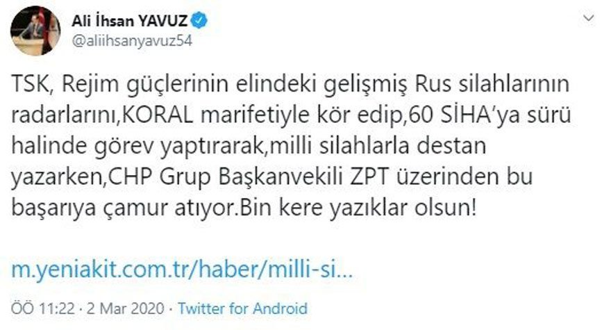 * TSK, rejim güçlerinin elindeki gelişmiş Rus silahlarının radarlarını, KORAL marifetiyle kör edip, 60 SİHA’ya sürü halinde görev yaptırarak, milli silahlarla destan yazarken, CHP Grup Başkanvekili ZPT üzerinden bu başarıya çamur atıyor.