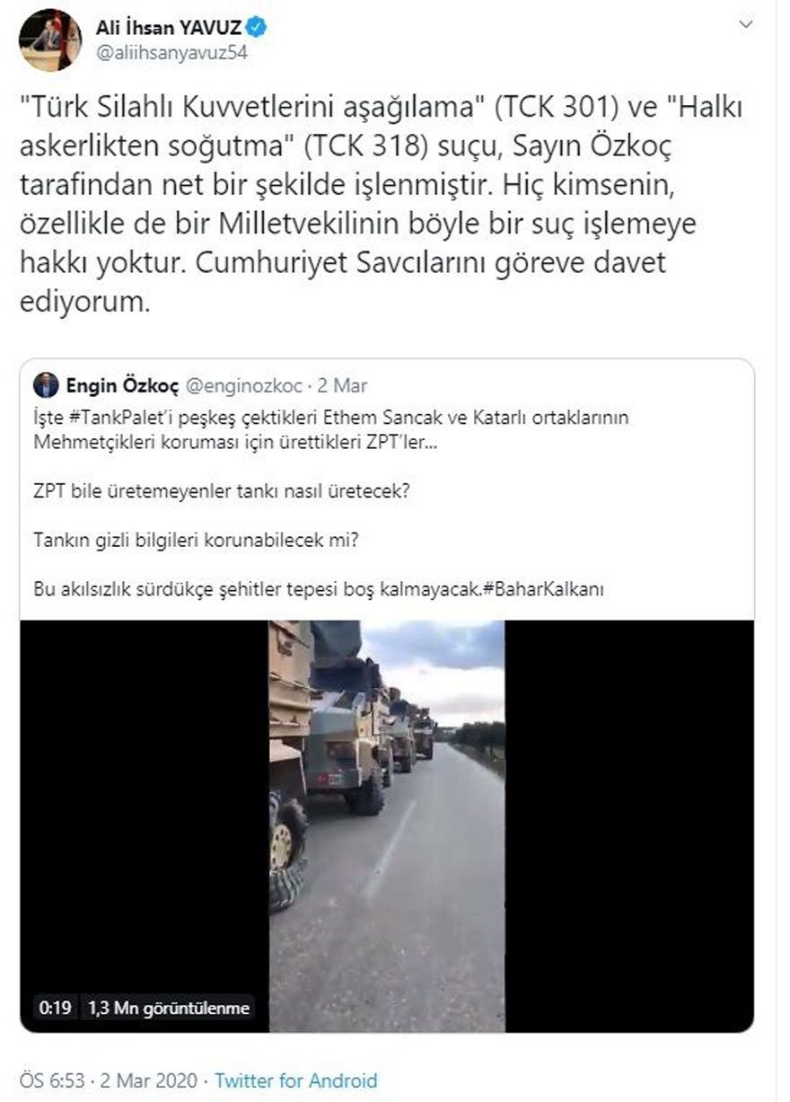 CHP Grup Başkanvekili Engin Özkoç, kişisel sosyal medya hesabından, Suriye’de Türk Silahlı Kuvvetleri’nin askeri personel taşımak için kullandığı ve lastikleri parçalanmış ZPT aracının videosunu paylaşarak eleştirilerde bulunmuştu.
