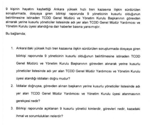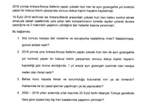 Alifuatpaşa-Eskişehir arasında 19 Eylül 2019’da kılavuz trenin raydan çıkmasına ilişkin soru önergesine verilen cevapta ise idari soruşturmanın sürdüğü kaydedildi.
