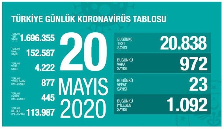 Son 24 saatte 32 hasta vefat etti, 1092 hasta iyileşti. Toplam test sayısı 1 milyon 832 bin 262, vaka sayısı 156 bin 827 ve vefat sayısı 4 bin 340 oldu.