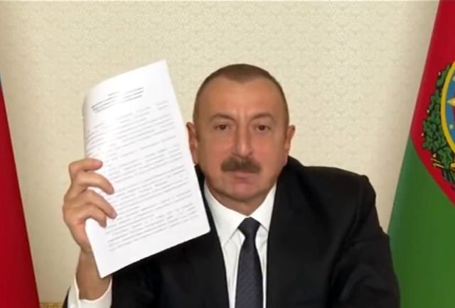 Aliyev sözlerine şu şekilde devam etti: “Sıçan gibi bu anlaşmayı ağlaya ağlaya imzalayacak. Dersini verdik. Kovduk onları topraklarımızdan. Demiştik, iti kovar gibi kovacağız demiştik ve kovduk onları. İti kovar gibi kovduk. Bu anlaşma Ermenistan’ın askeri yenilgisi anlamına gelmektedir. Paşinyan bu anlaşmayı kameralardan uzak bir yerde, korkakça imzalayacak. Kendi isteğiyle imzalamıyor. Demir yumruğumuz sayesinde imzalıyor. Bu anlaşma bizim şanlı zaferimizdir.” dedi.