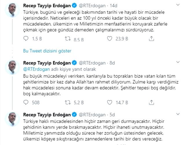 Cumhurbaşkanı Erdoğan, resmi Twitter hesabından önemli paylaşımlarda bulundu. Türkiye’nin bugünü ve geleceği bakımından tarihi ve hayati bir mücadelenin içerisinde olduğunu belirten Erdoğan, “Neticeleri en az 100 yıl önceki kadar büyük olacak bir mücadeleden, ülkemizin ve Milletimizin menfaatlerini koruyarak zaferle çıkmak için gece gündüz demeden çalışmalarımızı sürdürüyoruz” dedi.