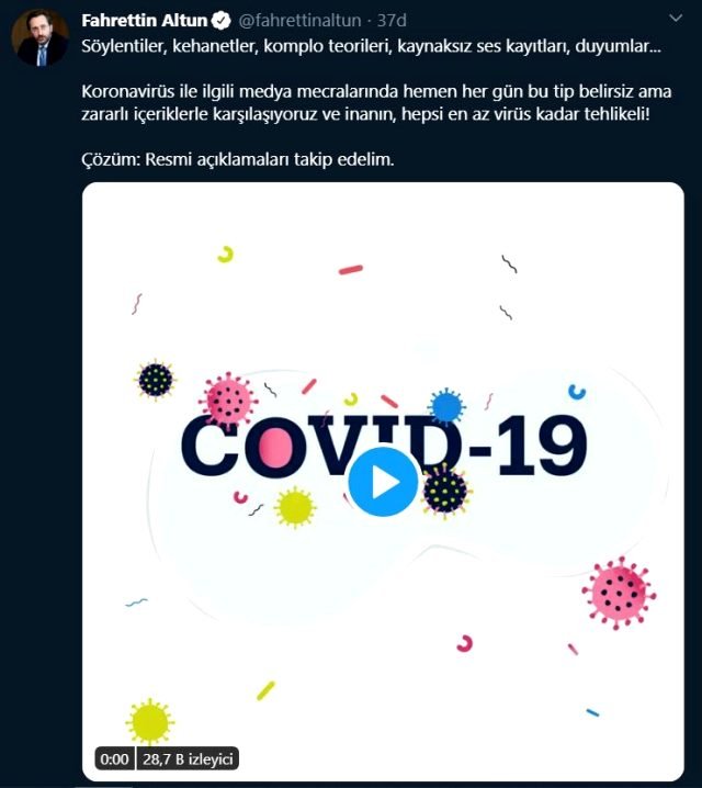 Altun, “Söylentiler, kehanetler, komplo teorileri, kaynaksız ses kayıtları, duyumlar… Koronavirüs ile ilgili medya mecralarında hemen her gün bu tip belirsiz ama zararlı içeriklerle karşılaşıyoruz ve inanın, hepsi en az virüs kadar tehlikeli! Çözüm: Resmi açıklamaları takip edelim.” ifadelerini kullandı.