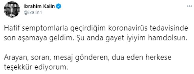 Sağlık durumu hakkında bilgi veren İbrahim Kalın, hafif semptomlarla geçirdiği koronavirüs tedavisinde son aşamaya geldiğini belirterek, “Şu anda gayet iyiyim hamdolsun. Arayan, soran, mesaj gönderen, dua eden herkese teşekkür ediyorum.” ifadelerini kullandı.
