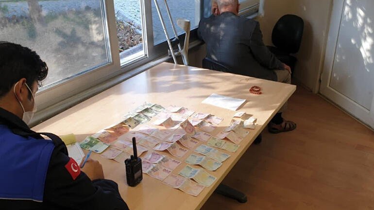 Dilencilikten elde edildiği değerlendirilen paraya el konulan adamın koltuk değnekli olarak dilenme ve yakalanma anı güvenlik kamerasına yansıdı.