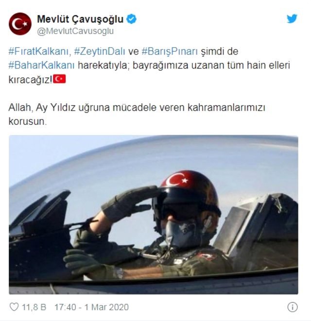 Bakan Çavuşoğlu mesajında, “Fırat Kalkanı, Zeytin Dalı ve Barış Pınarı şimdi de Bahar Kalkanı harekatıyla, bayrağımıza uzanan tüm hain elleri kıracağız. Allah, Ay Yıldız uğruna mücadele veren kahramanlarımızı korusun” ifadelerini kullandı.