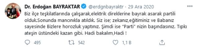 Eski Bakan Bayraktar, geçen ay sosyal medyada “Biz ilçe teşkilatlarında çalışarak, elektrik direklerine bayrak asarak partili olduk. Sonunda mancınıkla atıldık. Siz ise; zekanız, eğitiminiz ve Babanız sayesinde Bizlere horozluk yaptınız. Şimdi ise ‘Parti’nizin başındasınız. Tıpkı ateşin üstündeki kazan gibi. Hadi bakalım, Hadi!” mesajını paylaşmıştı.