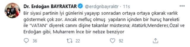 Erdoğan Bayraktar yeni yaptığı paylaşımda ise yeni parti kurma hazırlığı yapan Muharrem İnce‘ye değindi. Bayraktar, şu ifadeleri kullandı: