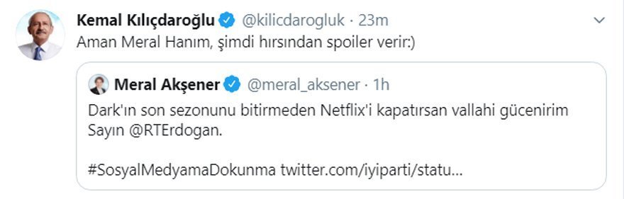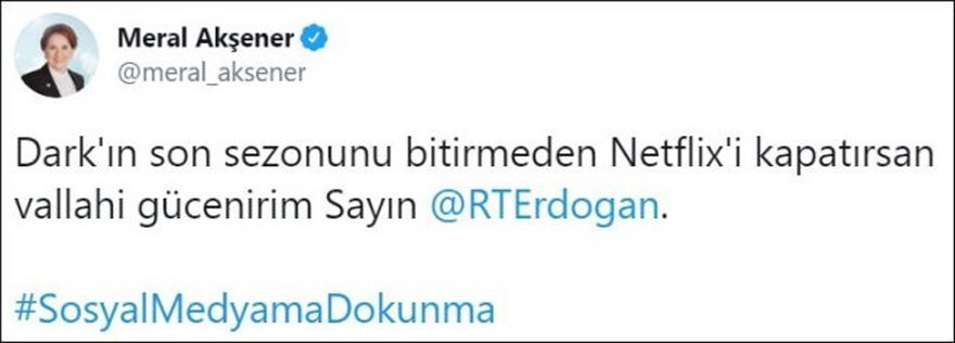 Twitter hesabından Erdoğan’ın sözlerini de alıntılayarak paylaşımda bulunan Akşener, Netflix’in popüler dizilerinden Dark’a gönderme yaparak “Dark’ın son sezonunu bitirmeden Netflix’i kapatırsan vallahi gücenirim Sayın @RTErdogan” dedi.