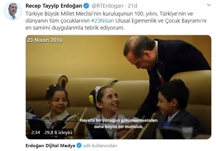 Cumhurbaşkanı Recep Tayyip Erdoğan, Türkiye Büyük Millet Meclisi’nin kuruluşunun 100. yılı olan 23 Nisan Ulusal Egemenlik ve Çocuk Bayramı nedeniyle bir mesaj yayınladı. Cumhurbaşkanı Erdoğan, twitter hesabından bir mesaj ve 2 dakika 39 saniyelik bir video paylaştı.