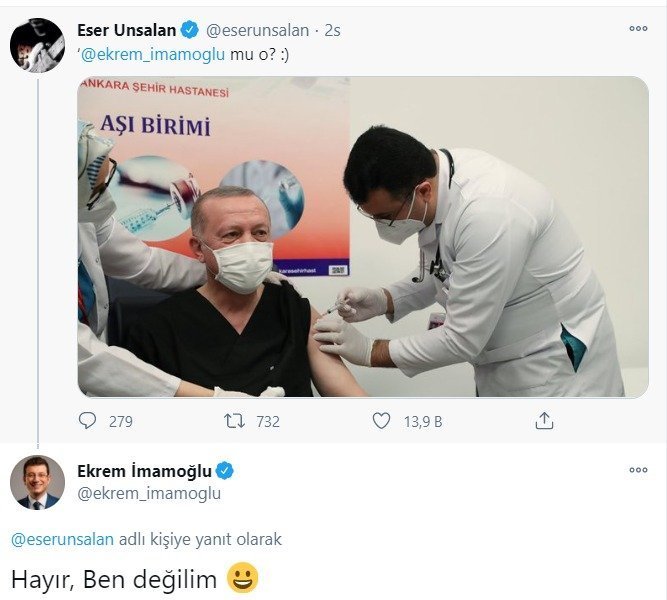 Cumhurbaşkanı Erdoğan’ın hastanedeki fotoğrafı sosyal medyada çok paylaşılanlar arasında girdi. Corona virüsü aşısını yapan doktorun İstanbul Büyükşehir Belediye Başkanı Ekrem İmamoğlu’na benzetilmesi kullanıcılar arasında konuşuluyor.