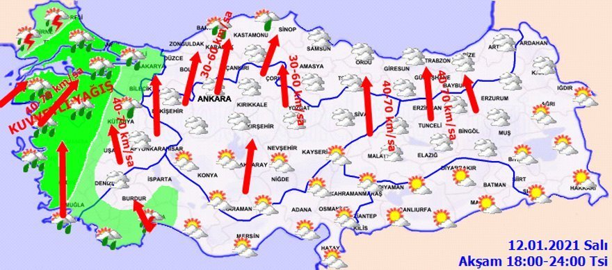 * Marmara’nın güneyi, Ege, İç Anadolu’nun güney ve doğusu, Akdeniz’in iç ve yüksek kesimleri ile Orta ve Doğu Karadeniz’in iç kesimlerinde güney yönlerden kuvvetli rüzgar ve fırtına (50-80 km/sa, yüksek kesimlerde kısa süreli kuvvetli fırtına (90-120 km/sa) beklendiğinden ulaşımda aksamalar, çatı uçması, ağaç devrilmesi, soba ve baca gazı zehirlenmeleri, İç Anadolu’nun güneyinde toz fırtınası gibi olumsuzluklara karşı dikkatli ve tedbirli olunmalıdır.
