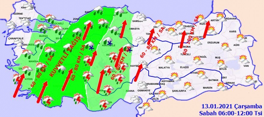 * Bu akşam ve gece saatlerinde İzmir, Aydın, Manisa, Balıkesir, Bursa çevrelerinde kısa süreli gök gürültülü sağanak yağış geçişleri bekleniyor. Yerel kuvvetli yağışla birlikte rüzgarın da kuvvetli ve kısa süreli fırtına şeklinde esmesi beklendiğinden meydana gelebilecek ulaşımda aksamalar, su baskını, çatı uçması, ağaç devrilmesi, yıldırım, küçük çaplı dolu yağışı, hortum oluşma riski gibi olumsuzluklara karşı dikkatli ve tedbirli olunmalıdır.
