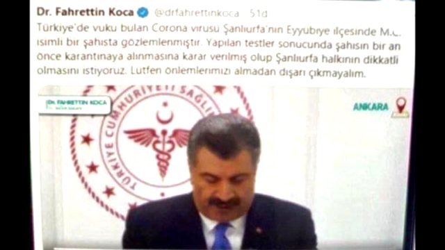 Şanlıurfa’da öğle saatlerinde sosyal medya hesaplarında Sağlık Bakanı Fahrettin Koca’nın fotoğrafı üzerine “Türkiye’de vuku bulan koronavirüs Şanlıurfa’nın Eyyübiye ilçesinde M.O isimli bir şahısta gözlemlenmiştir. Yapılan testler sonucunda şahsın bir an önce karantinaya alınmasına karar verilmiş olup Şanlıurfa halkının dikkatli olmasını istiyoruz. Lütfen önlemlerinizi almadan dışarı çıkmayın” yazılı paylaşım kısa sürede yayıldı. Kentte paniğe neden olan paylaşımlar üzerine harakete geçen Şanlıurfa Valiliği uyarıda bulunarak, il genelinde herhangi koronavirüs vakasına rastlanmadığını bildirdi.