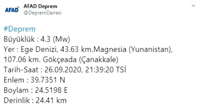 İçişleri Bakanlığı Afet ve Acil Durum Yönetimi Başkanlığı (AFAD) verilerine göre; Ege Denizi‘nde Gökçeada açıklarında saat 21.39’da 4.3 büyüklüğünde deprem meydana geldi. Deprem, yerin 24 kilometre derinliğinde gerçekleşti. Deprem nedeniyle can ve mal kaybı olmadı.