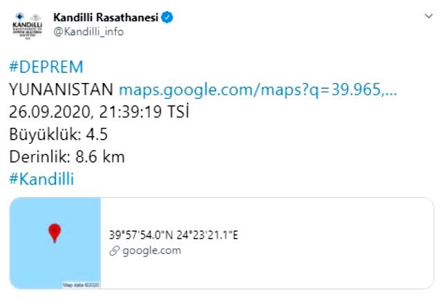 Boğaziçi Üniversitesi Kandilli Rasathanesi ise depremin şiddetini 4.5 olarak ölçtü. Kandilli’nin verilerine göre deprem yerin 8.6 kilometre derinliğinde meydana geldi.