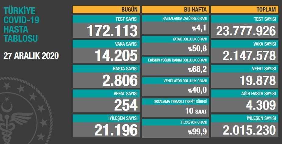 Bugün toplam 172 bin 113 test yapıldı. Semptom gösteren 2 bin 806 kişiyle birlikte toplam 14 bin 205 yeni vaka tespit edildi. Türkiye’de toplam vaka sayısı 2 milyon 147 bin 578 oldu.
