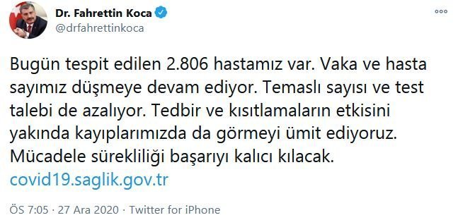 Sosyal medya hesabından güncel verilere ilişkin açıklama yapan Sağlık Bakanı Fahrettin Koca, şu ifadeleri kullandı: