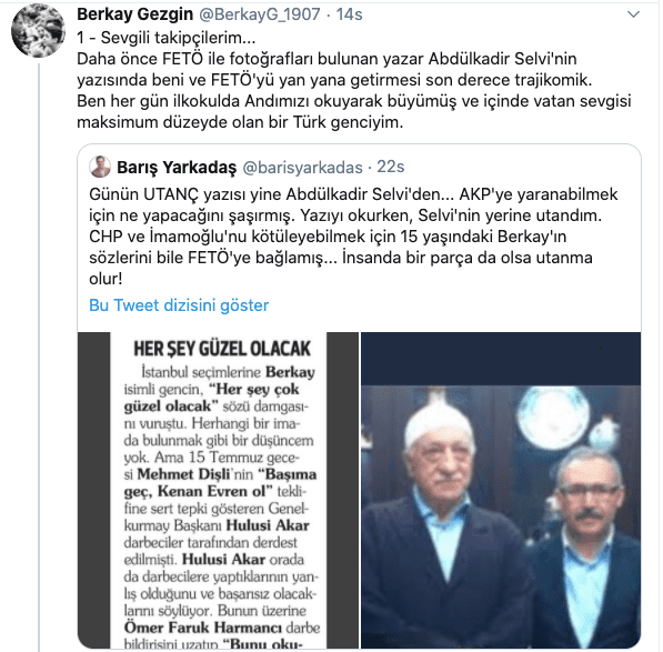 Sloganın çıkış sebebi olan Berkay Gezgin isimli genç, Twitter hesabından Selvi’ye cevap vererek, “Daha önce FETÖ ile fotoğrafları bulunan yazar Abdülkadir Selvi’nin yazısında beni ve FETÖ’yü yan yana getirmesi son derece trajikomik” ifadelerini kullandı.