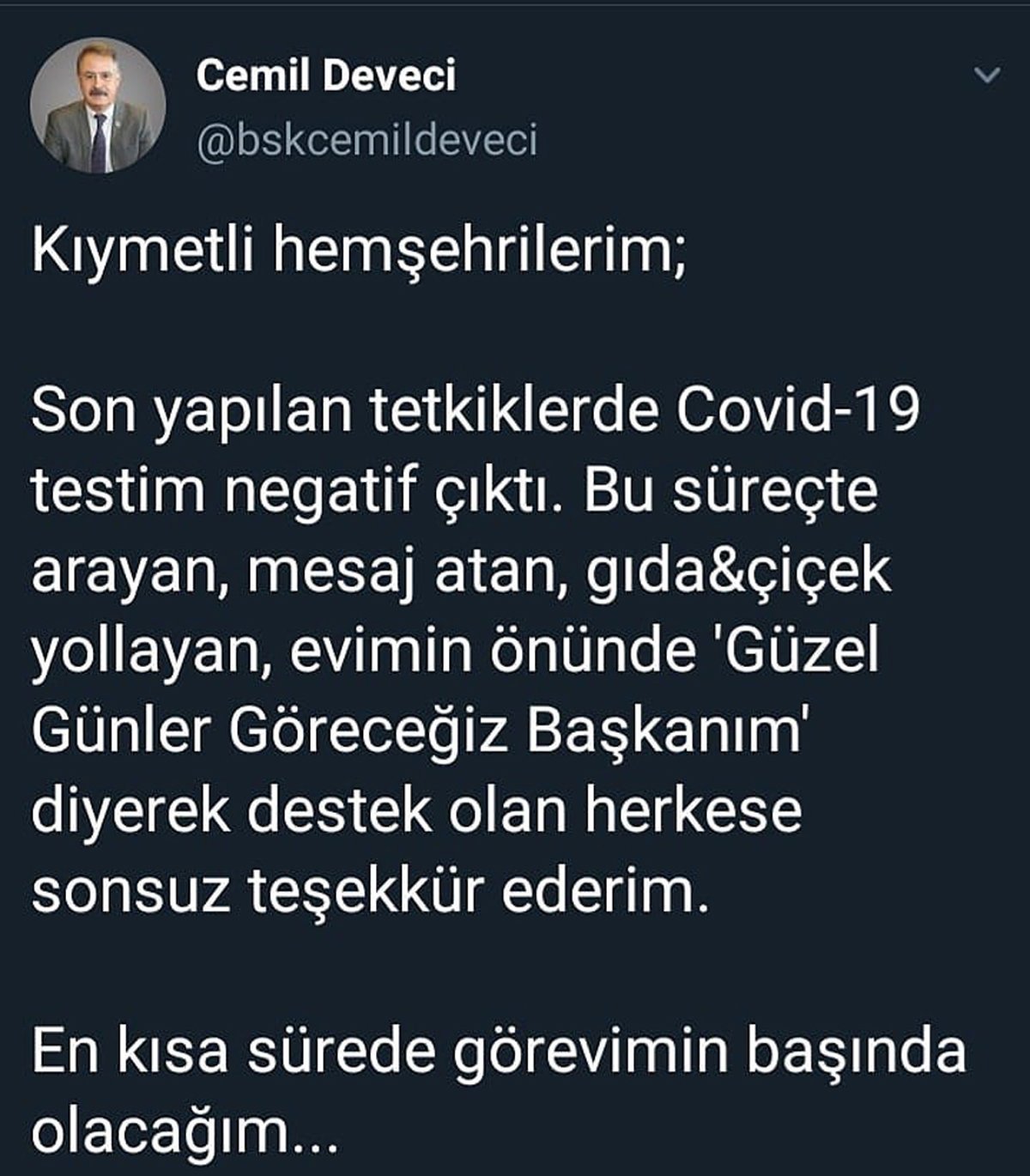 “Kıymetli hemşehrilerim; Son yapılan tetkiklerde Covid-19 testim negatif çıktı. Bu süreçte arayan, mesaj atan, gıda, çiçek yollayan, evimin önünde ‘Güzel Günler Göreceğiz Başkanım’ diyerek destek olan herkese sonsuz teşekkür ederim. En kısa sürede görevimin başında olacağım” diye yazdı.