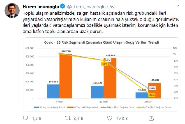 Toplu taşıma verileri ile ilgili istatistikleri Twitter hesabından paylaşan İstanbul Büyükşehir Belediye Başkanı Ekrem, risk altındaki yaş grubunda toplu taşıma kullanımının hâlâ yüksek olduğunu kaydetti.