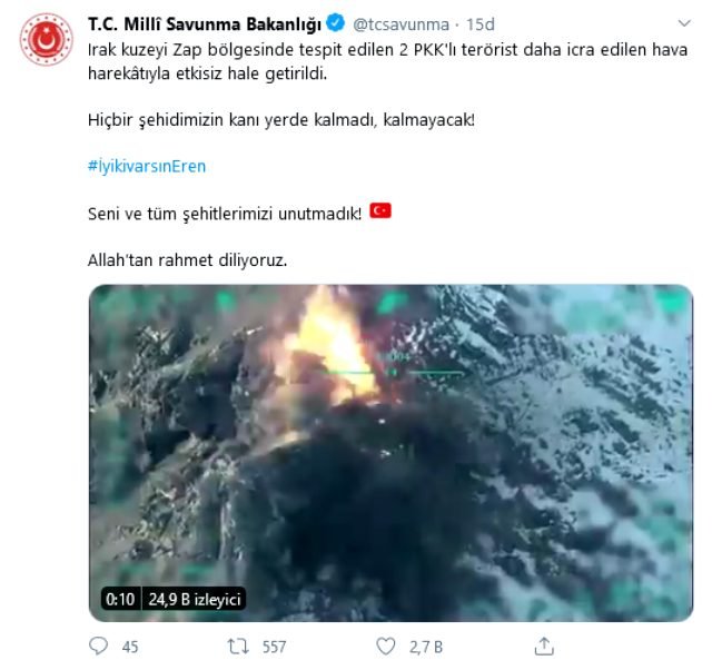 MSB, konuyla ilgili sosyal medyadan yaptığı açıklamada, “Irak kuzeyi Zap bölgesinde tespit edilen 2 PKK’lı terörist daha icra edilen hava harekâtıyla etkisiz hale getirildi. Hiçbir şehidimizin kanı yerde kalmadı, kalmayacak! #İyikivarsınEren. Seni ve tüm şehitlerimizi unutmadık!”
