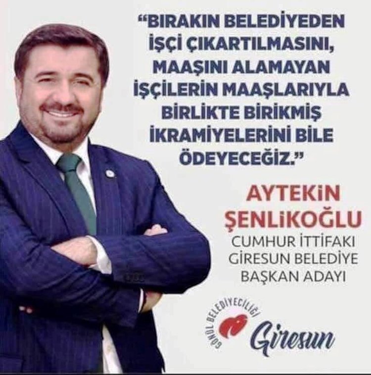 “Giresun Belediyesi bünyesinde 5393 sayılı Belediye Kanunu’nun 49’uncu Maddesi uyarınca Sözleşmeli Personel olarak görev yapmaktasınız. 657 sayılı Kanun’un 4’üncü Maddesi’nin (B) bendi uyarınca hizmetin gerektirdiği pozisyona ihtiyaç kalmaması nedeniyle, 31.12.2019 tarihi itibari ile sözleşmeniz yenilenmeyecektir. Bilgilerinize ricaen tebliğ ederiz.” Yazının gönderildiği diğer çalışanlar diken üstünde. “Seçim öncesi kimseyi çıkarmayacağım” diyen AKP’li Başkan Şenlikoğlu’nun, “Giresun Belediyesi tarihinde en fazla işçi çıkaran başkan” sıfatı kazandığı bildirildi. CHP ve İYİ Parti, işten çıkarmalara tepki gösterdi.