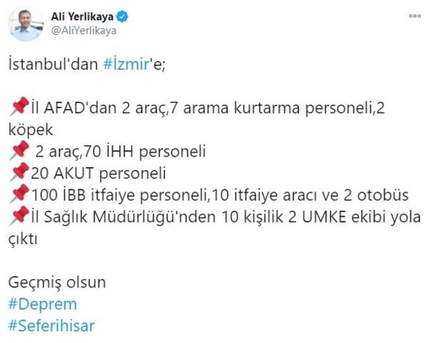 Sosyal medya hesabından açıklama yapan Yerlikaya İzmir’e “İl AFAD’dan 2 araç,7 arama kurtarma personeli,2 köpek, 2 araç,70 İHH personeli, 20 AKUT personeli, 100 İBB itfaiye personeli,10 itfaiye aracı ve 2 otobüs, İl Sağlık Müdürlüğü’nden 10 kişilik 2 UMKE ekibi yola çıktı.” dedi.